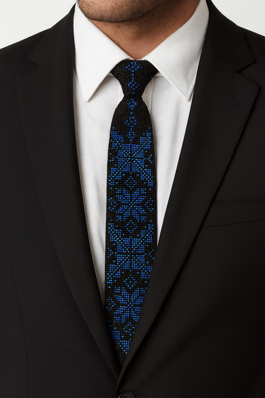 With intricate embroidery rooted in Palestinian tradition, the Azraq Tatreez Tie honors both culture and craft. Handmade by women artisans, it is designed to stand out with sophistication and pride. Perfect for meaningful gatherings and elegant moments.